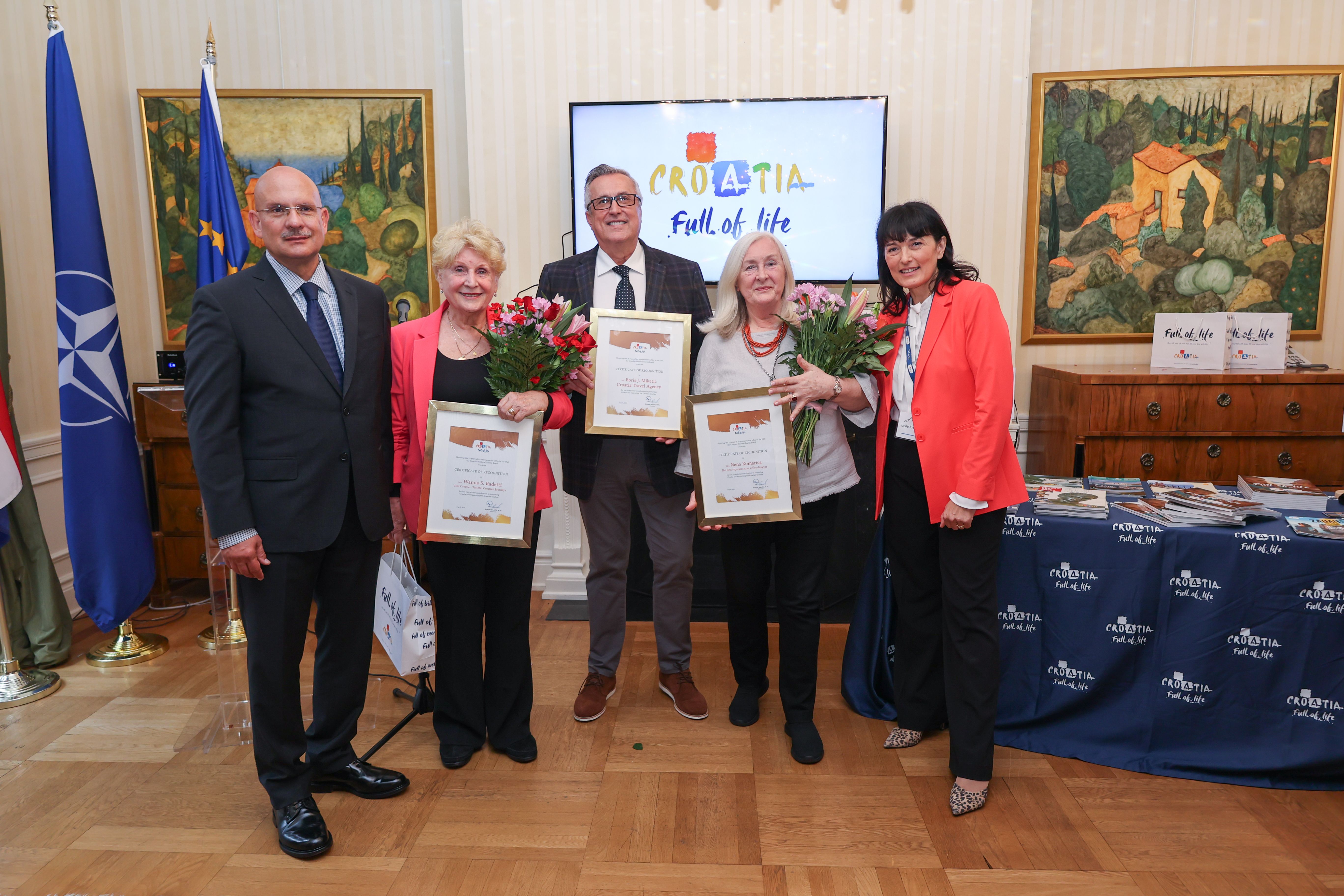 As part of the celebration, special awards were presented for outstanding contribution to the promotion of Croatia on the North American market, and the following were honored: Niko Hazdovac and Peter Hazdovac from Adriatic Travel Tours, Boris J. Miketić from Croatia Travel Agency, Wanda S. Radetti from Visit Croatia - Tasteful Croatian Journeys, Ivica Glavinić from Pan Adriatic Travel Agency and art historian and the first director of the Croatian National Tourist Office in the US, Nena Komarica.
