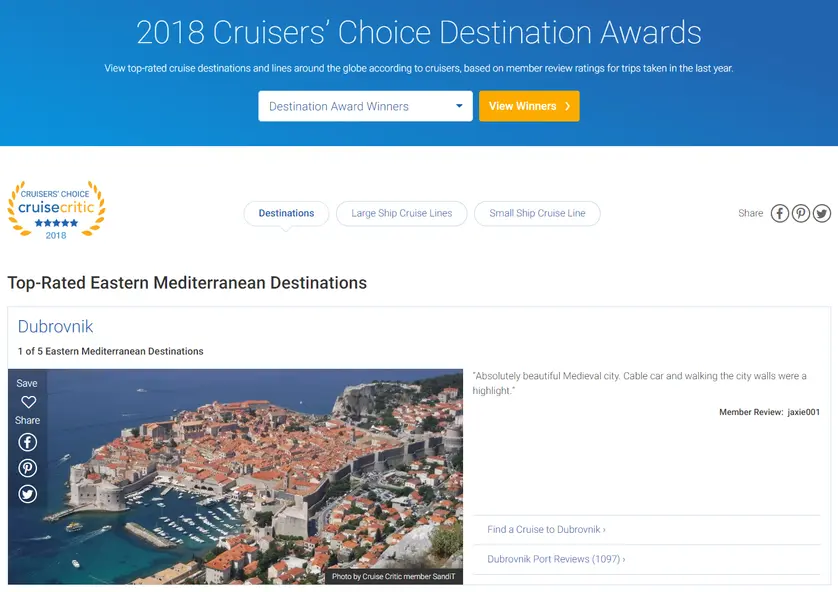 According to the choice of the specialised portal for cruising ‘Cruise Critic’, Dubrovnik has been declared the best cruising destination in the Eastern Mediterranean category for the second year in a row. The significance of the ‘Cruisers’ Choice Destination Awards’ award is even greater if we take into account that the choice was made by the users of this popular web portal themselves and cruising fans who with their numerous positive comments describe Dubrovnik as a desired cruising destination of an extremely rich cultural-historical heritage. After Dubrovnik, in the mentioned category, came Kotor, Venice, Santorini and Rhodes.