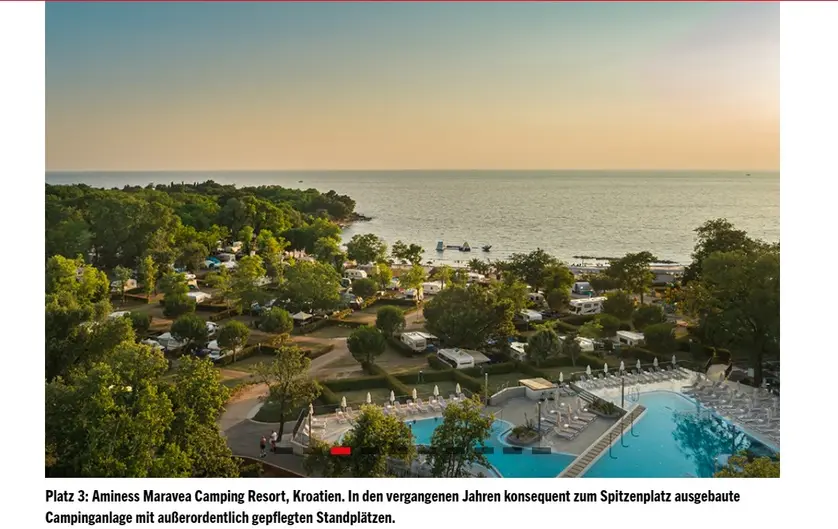 Povoljnu poziciju Hrvatske na njemačkom tržištu potvrđuje najnovija lista top 10 kampova Europe, koju je objavio portal ADAC-a posvećen kamping segmentu PinCamp. Na navedenoj se listi na prva dva mjesta nalaze njemački kampovi, dok odlično 3. i 4. mjesto zauzimaju hrvatski kampovi Aminess Maravea Caming Resort iz Novigrada i Camping Omišalj. Među top 10 europskih kampova nalazi se još jedan hrvatski kamp, a riječ je o kampu Zaton Holiday Resort koji je zauzeo 6. mjesto. Promatrajući popis najpopularnijih kampova po zemljama, vodeća je Njemačka s 53 kampa, a zatim slijedi Hrvatska s 26 kampova te Italija s 18 kampova.