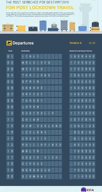 Dobre trendove i najave s američkog tržišta za Hrvatsku potvrđuju podaci Elektroničkog sustava za autorizaciju putovanja (Electronic System for travel Authorization - ESTA) koji je objavio pregled destinacija koje su korisnici najviše pretraživali u razdoblju nakon lockdowna. Naime, prema objavljenim podacima Hrvatska je s preko 810 tisuća pretraga na Google tražilici zauzela visoko 14. mjesto najtraženijih destinacija. Vodeća je Italija, a među najtraženijim svjetskim destinacijama našli su se i Maldivi, Meksiko, Tajland, Španjolska, Kanada, Grčka i dr.