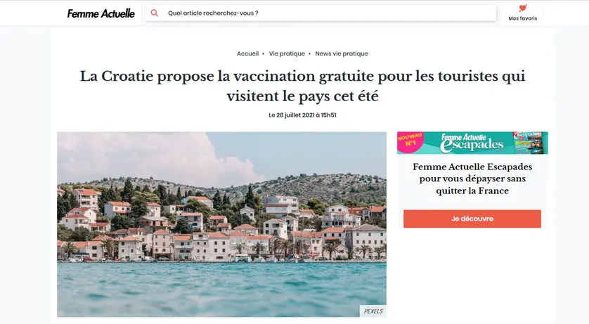 Vijest o besplatnom cijepljenju za turiste u Hrvatskoj objavio je najčitaniji francuski ženski časopis Femme Actuelle, dok je turistički portal Class Tourisme predstavio Hrvatsku kao najsigurniju destinaciju na Mediteranu.