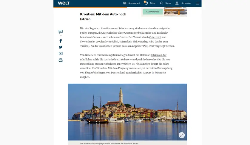 Autor članka Sönke Krüger navodi kako je u Istru moguće otputovati bez karantene na ulasku u Hrvatsku i povratku u Njemačku, uz obvezu predočenja negativnog PCR testa, a dodatno je naglašeno kako je Istra, od hrvatskih regija koje su trenutno označene kao „zelene“, najatraktivnija i prometno najdostupnija hrvatska regija za njemačke posjetitelje. U članku se također prenose informacije njemačkih turoperatora koji bilježe veliki interes za odmorom u Istri te je istaknuto kako su brojni istarski hoteli već otvoreni, dok će broj dostupnog smještaja dodatno rasti u narednim mjesecima.