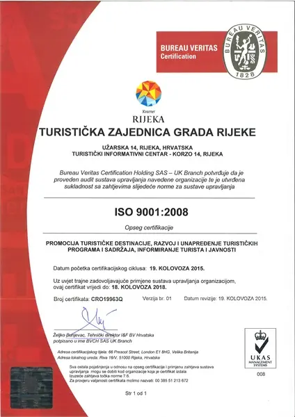 Uvedeni ISO 9001:2008 potvrđuje kvalitetu aktivnosti koje provodi TZ Rijeke, odnosno potvrđuje kvalitetu usluga koje se pružaju članovima, gostima i partnerima.