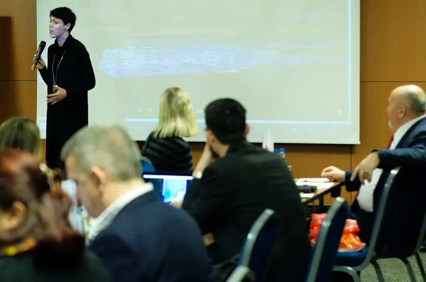 Agnieszka Anna Puszczewicz drži prezentaciju na radionici u Varšavi.