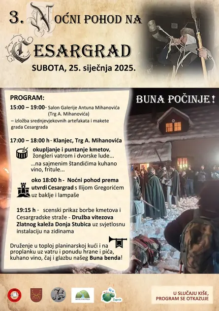Noćni pohod na Cesargrad, kojim se simbolično obilježava početak slavne Seljačke bune, održat će se 25. siječnja. Ovogodišnji program bit će obogaćen srednjovjekovnim lakrdijaškim programom i uvijek atraktivnim žongliranjem vatrom artista iz Cirkulture, a na trgu posjetitelje očekuju i vruće domaće fritule, a za zagrijavanje kuhano vino i čaj. Nakon puntanja na čelu sa seljačkim vođom Ilijom Gregorićem, oko 18 sati krenut će se s bakljama u rukama u noćni pohod prema utvrdi Cesargrad.