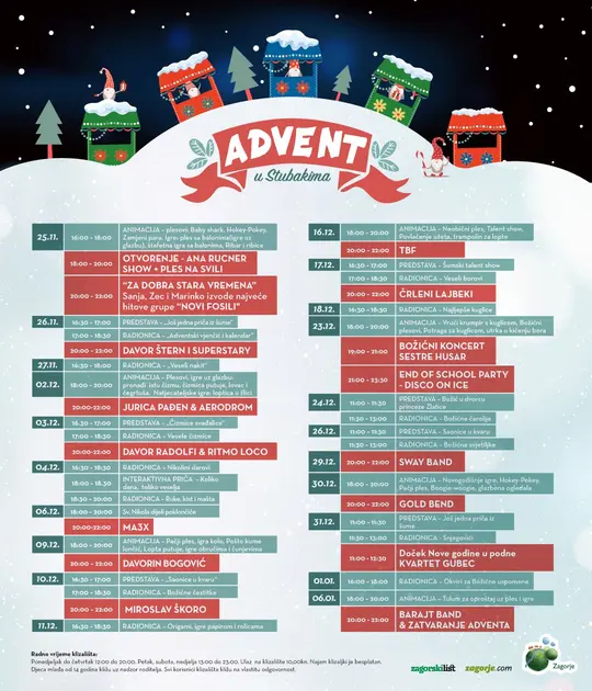 Advent u Stubakima trajat će do 6. siječnja 2023., a velike i male ljubitelje božićnih čarolija i zimskih radosti očekuje odličan i bogat program na dvije pozornice. Naše najmlađe svakodnevno očekuju animacije, predstave i radionice, a posjetit će ih i Sveti Nikola i Djed Božićnjak koji će im podijeliti prigodne poklončiće. Svi iskusni i manje iskusni klizači mogu iskušati svoje vještine na najvećem klizalištu sa stazom u Zagorju.