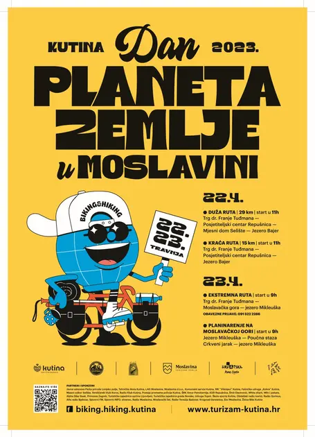 Turistička zajednica grada Kutine, Biciklistički klub Kutina i Planinarsko društvo Yeti Kutina vas pozivaju na veliku rekreativno-zabavnu manifestaciju „Dan planeta Zemlje u Moslavini“ koja se održava za vikend 22.-23. travnja u Kutini, a uključuje biciklijade i planinarenje u prekrasnom krajoliku Moslavine.