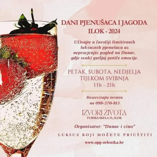 Dani pjenušaca i jagoda održavaju se u Iloku, na lokaciji Turska skela 33. Posjete su moguće u tri različita termina: 10.05.-12.05., 17.05.-19.05. i 24.05.-26.05.2024.