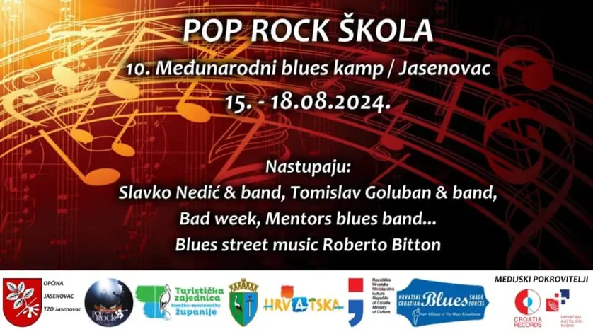Pop rock škola trajat će od 15. do 18. kolovoza, a djeca zainteresirana za blues kamp, koji će se održati 16. kolovoza u 10 sati u Pučkom domu Jasenovac, mogu se prijaviti za Klavijature, gitaru i bubnjeve Prijave na broj: 095 9030 950.