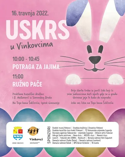 Turistička zajednica grada Vinkovaca ove godine organizira veliku potragu za pisanicama kako bi najmlađi bolje upoznali posebne lokacije svoga grada. Na Gradskom parku Vinkovci i Trgu bana Josipa Šokčevića u subotu, 16. travnja u 10 sati posjetitelje će dočekati Zeko s uputama o lokacijama pisanica, koje ujedno kriju poklone. Potraga traje do 10:45 sati, a nakon toga je s pronađenim pisanicama potrebno doći u Ured Turističke zajednice grada Vinkovaca, kako bi preuzeli svoje nagrade. Sudionike očekuje i predstava "Ružno pače", koja će se održati na Trgu bana Josipa Šokčevića ispred Gimnazije s početkom u 11 sati.
