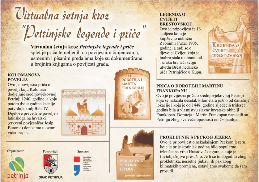 Turistička zajednica Grada Petrinje snimila je nekoliko video priča posvećenih petrinjskim legendama i pričama, a virtualnom šetnjom vodi nas i daleko u prošlost. Virtualna šetnja kroz Petrinjske legende i priče splet je priča temeljenih na povijesnim činjenicama, usmenim i pisanim predajama koje su dokumentirane u brojnim knjigama o povijesti grada. Turistička zajednica vas poziva da nakon virtualne šetnje, posjetite doživite Petrinju i njezine lokacije uživo u pratnji interpretatora i vodiča