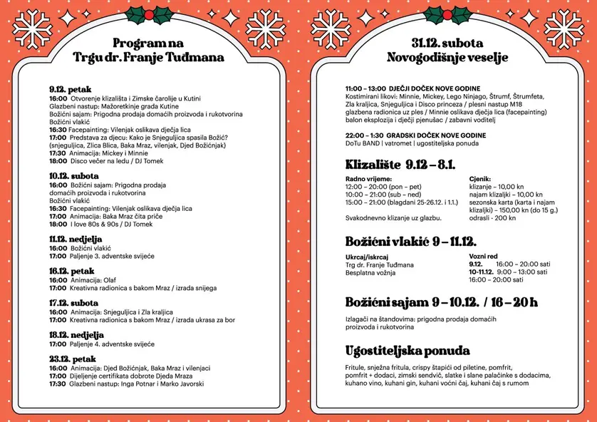 Turistička zajednica Grada Kutine će u suradnji s Komunalnim servisima i uz potporu Grada Kutine napraviti svoju božićnu priču na Trgu dr. Franje Tuđmana na kojem će se postaviti klizalište. U sklopu te manifestacije prometovat će božićni vlakić od 9. do 11. prosinca, disco večeri na ledu, ugostiteljska ponuda i brojni drugi sadržaji. Najmlađi posjetitelji moći će sudjelovati u brojnim aktivnostima, od animacije, kreativnih radionica i predstava, Kuće Djeda Mraza, oslikavanja lica, a zimsku čaroliju će moći trajno zabilježiti fotografiranjem u prigodno uređenim foto točkama. U sklopu manifestacije održat će se i tradicionalni Božićni sajam od 9. do 10. prosinca, koji će okupiti brojne lokalne izlagače s bogatom ponudom jedinstvenih i unikatnih proizvoda i rukotvorina.