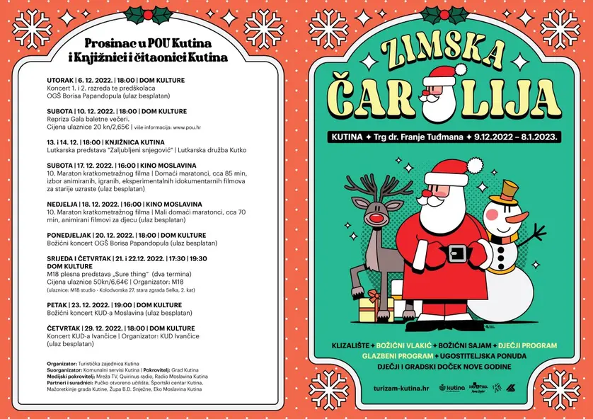Uz bogate blagdanske ukrase, dekoracije i instalacije, blagdanska čarolija će i ove godine ponovno zavladati gradom Kutinom. U razdoblju od 9. prosinca 2022. do 8. siječnja 2023. održavat će se „Zimska čarolija“, manifestacija koja nudi brojne zanimljive sadržaje.