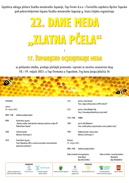 Slatko i medeno bit će za vikend u Top-Termama Topusko. Turistička zajednica Općine Topusko, Top-Terme i Zajednica udruga pčelara Sisačko-moslavačke županije u subotu i nedjelju 18. i 19. veljače u kompleksu Top-Termi upriličuju 22. Dane meda 'Zlatna pčela' i 17. Županijsko ocjenjivanje meda. Okupljaju se ponajbolji pčelari Sisačko-moslavačke županije, koji će prodavati med i ostale pčelinje proizvode, a Dani meda donose i stručno-znanstveni skup. Pčelari, agronomi, znanstvenici... govore o aktualnosti u Hrvatskom pčelarskom savezu, uzgoju matica, proizvodnji pića na bazi meda... Posjetitelji 'Zlatne pčele' tijekom oba dana trajanja pčelarske izložbe mogu kušati i nabaviti razne medene proizvode. Dani meda u Topuskom su pod pokroviteljstvom župana Ivana Celjaka.