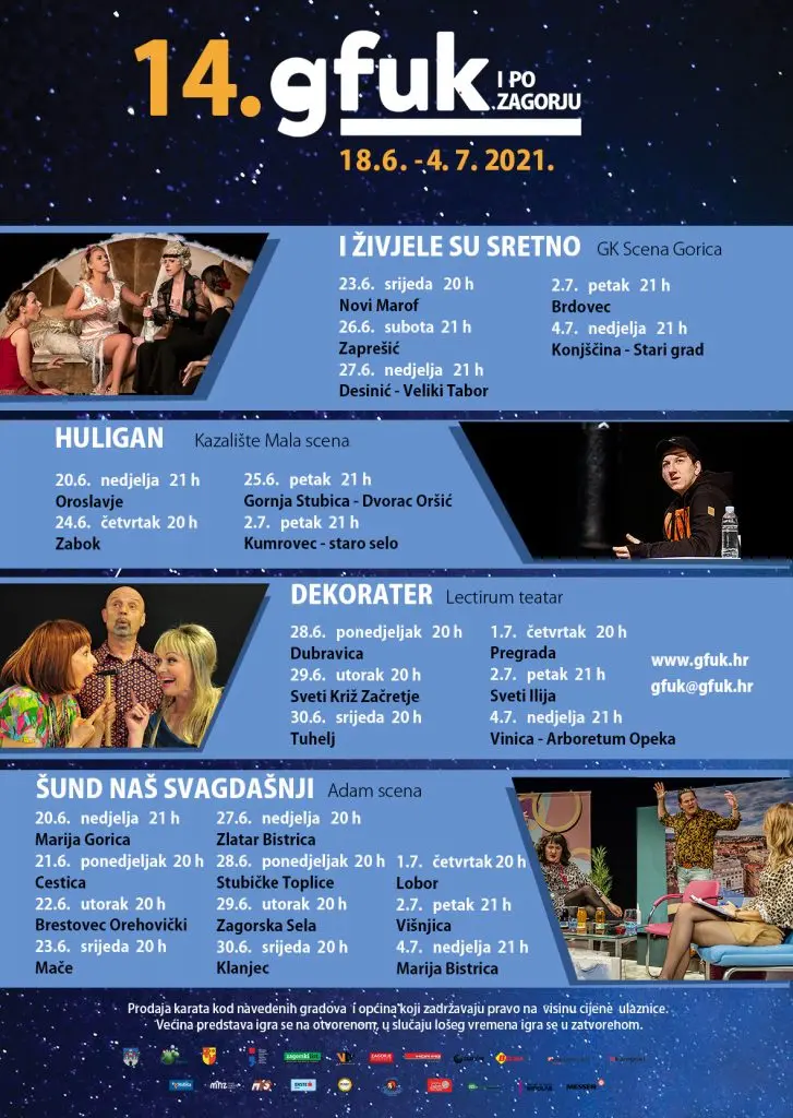 Četrnaesto izdanje Glumačkog festivala u Krapini i po Zagorju stiže za vjerne posjetitelje po prvi puta u ljetnom terminu, od 18. lipnja do 04. srpnja predstavama u Krapini i kroz nekoliko gostovanja po našem Hrvatskom zagorju.